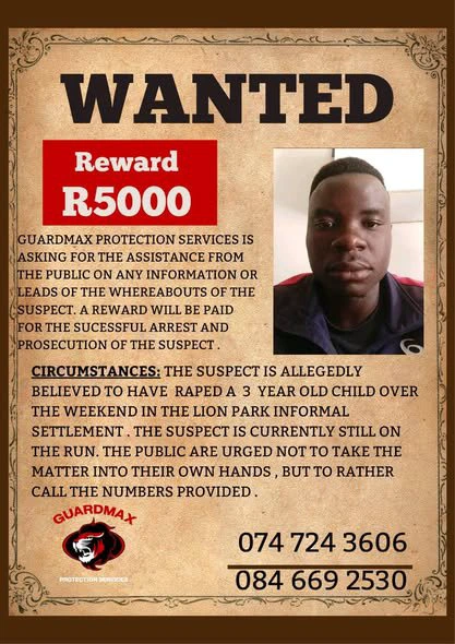 “Police can confirm that a suspect who was wanted for allegedly raping a three-year-old girl in Diepsloot was apprehended by the private security officers on Tuesday, September 9. He was charged with rape and appeared before Randburg Magistrate’s Court.”