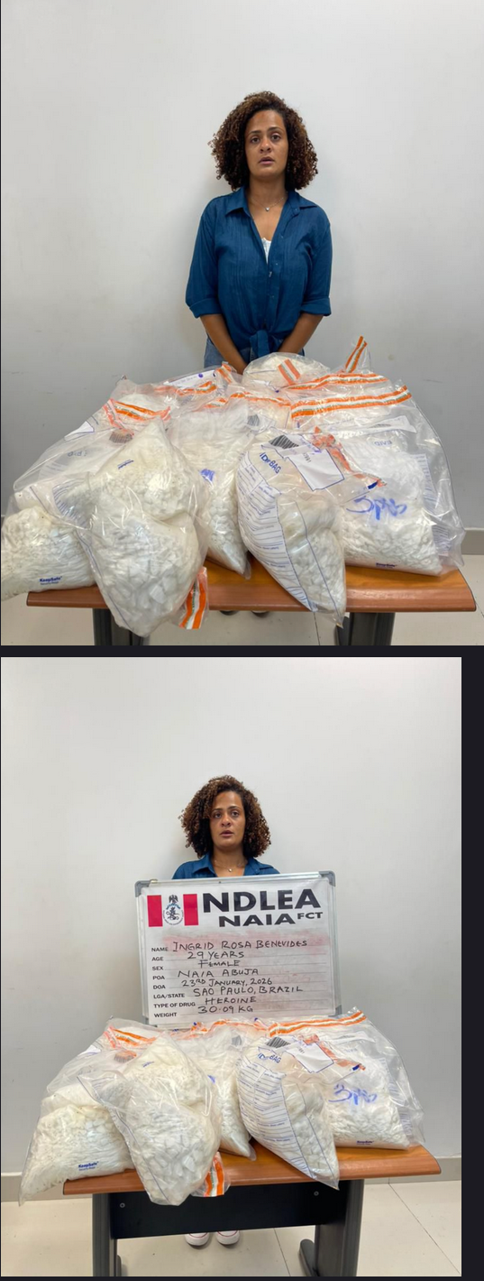 Operatives of the National Drug Law Enforcement Agency (NDLEA) have recorded a major breakthrough in Abuja after arresting a 30-year-old Brazilian woman, Ingrid Rosa Benevides, for allegedly attempting to smuggle 30.09 kilograms of heroin into Nigeria.....TAP TO CONTINUE READING