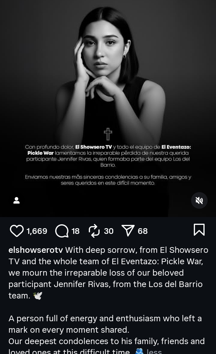 With deep sorrow, we at El Showsero TV and the whole team of El Eventazo: Pickle War mourn the irreparable loss of our beloved participant Jennifer Rivas, from the Los del Barrio team.