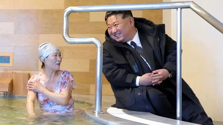 North Korea Supreme Leader Kim Jong-un pictured grinning in ‘North Korean Benidorm’ as he enters women’s pool