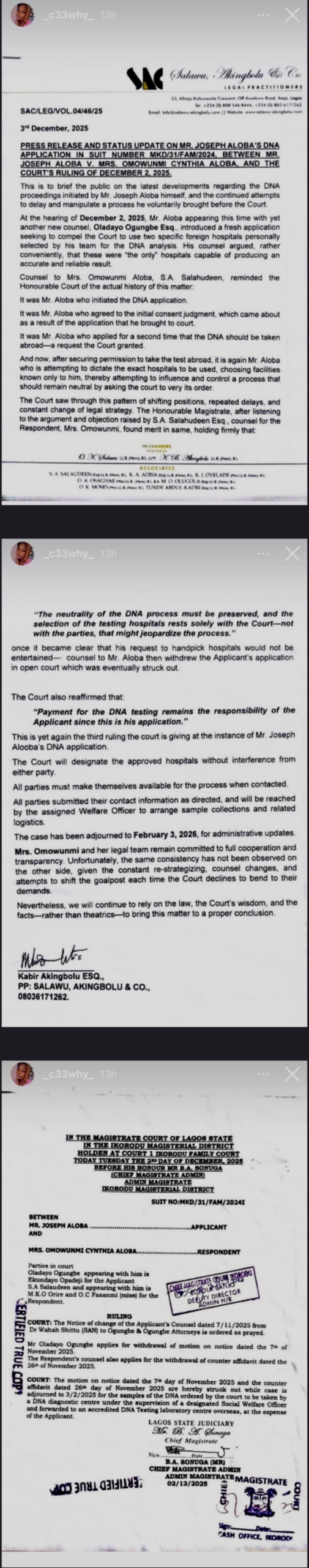 In a statement released on her IG page some hours ago, Wunmi hinted that her father in-law has been the one shifting the goal post, thereby delaying the DNA test to be carried out.