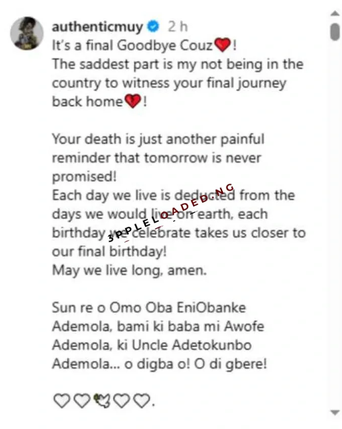 In his tribute, Muyiwa Ademola expressed deep pain over his cousin’s death and reflected on the uncertainty of life.