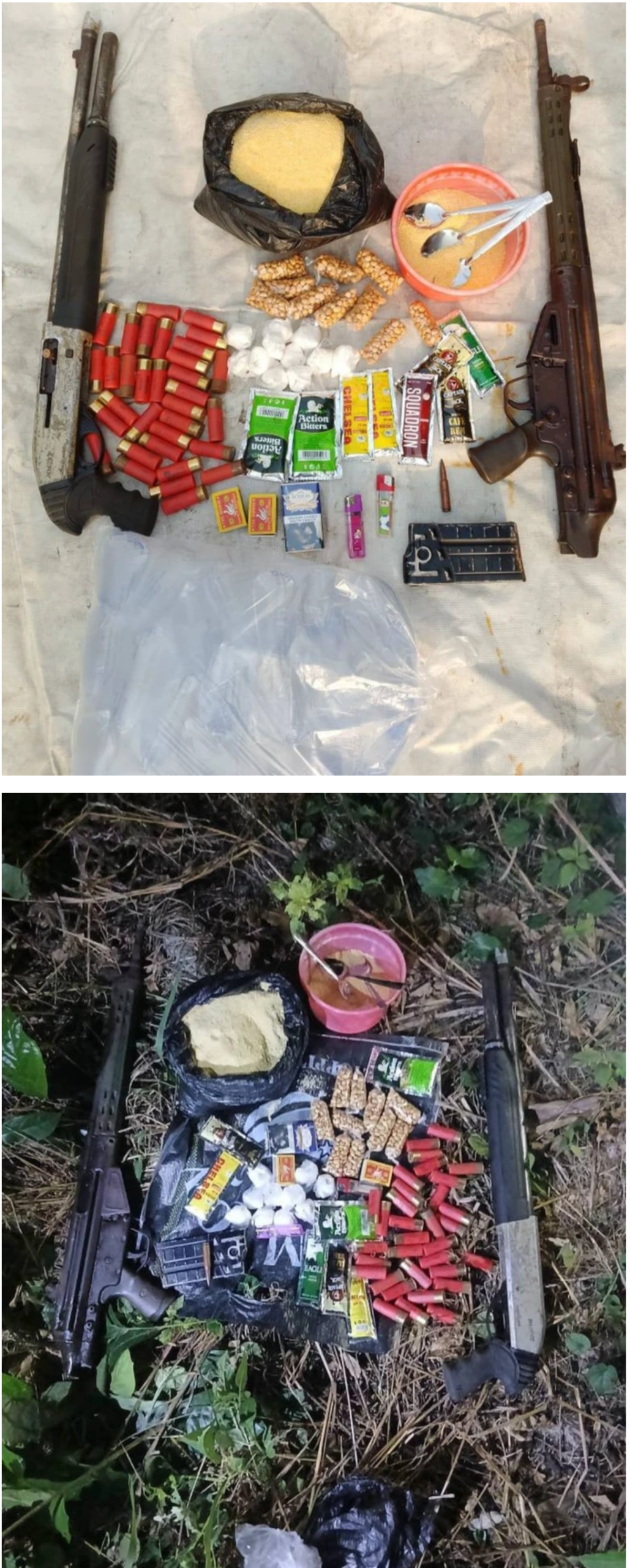 Photos of the items recovered include a bowl of soaked garri, with three spoons, nylons of groundnut, a nylon of garri, sachets of alcoholic drinks, matches, lighters, “one FNC rifle loaded with one round of live ammunition and one pump-action gun with thirty-two rounds of live cartridges.”