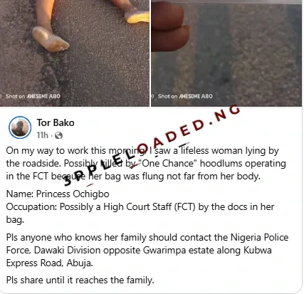 ‘’On my way to work this morning, I saw a lifeless woman lying by the roadside. Possibly killed by “One Chance” hoodlums operating in the FCT because her bag was flung not far from her body.