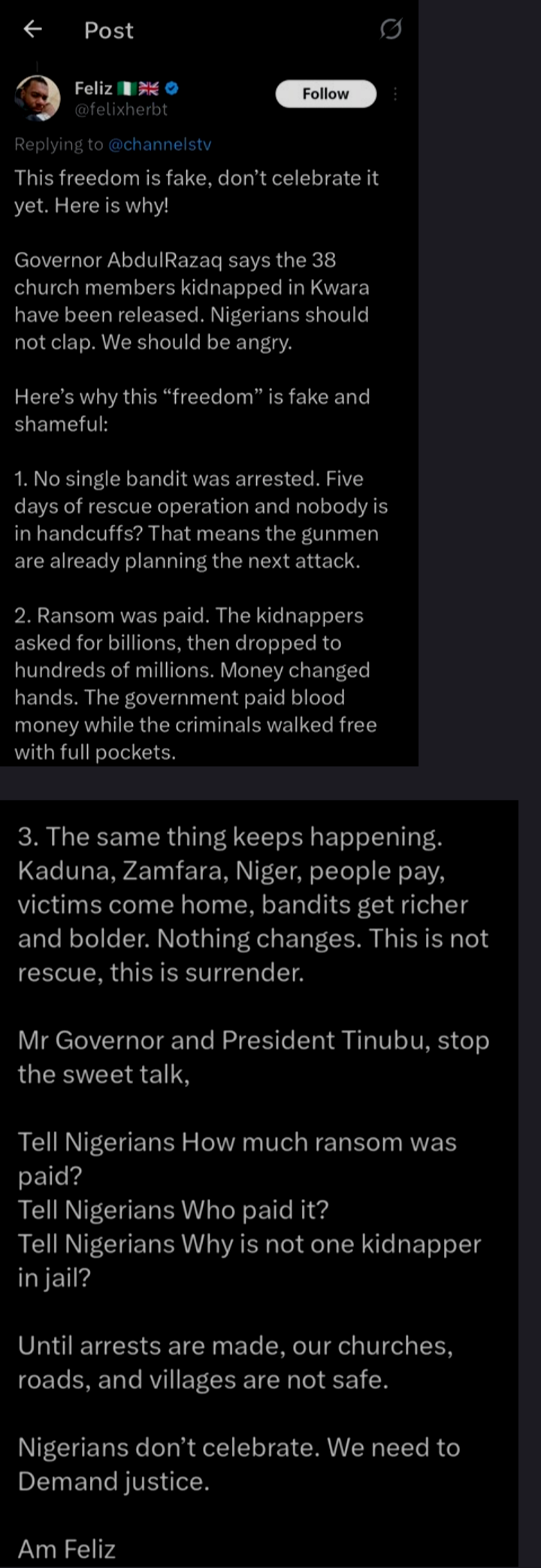 ?A user on the microblogging platform, X (formerly Twitter) has reacted to the release of the abducted Kwara church members.