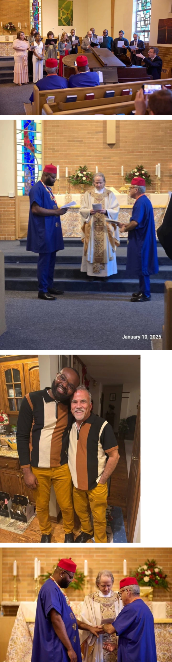 The wedding at St. Andrew’s Episcopal Church featured red caps, blue agbada, and liturgical elements, officiated by Rev. Gregg Morris.