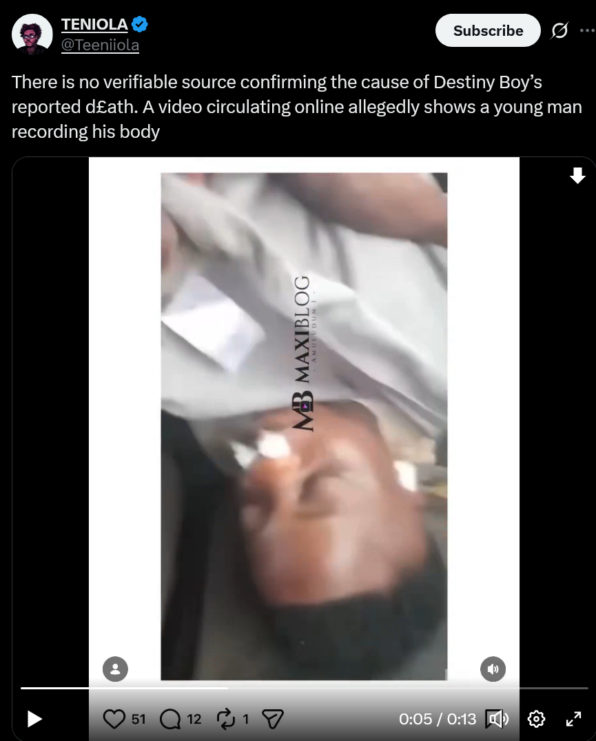 “Breaking: Reports claim that Destiny Boy is d£ad .” The account later followed up, stating there is “no verifiable source confirming the cause of Destiny Boy’s reported d£ath,” while sharing a short, low-quality video allegedly depicting a young man’s body being recorded.