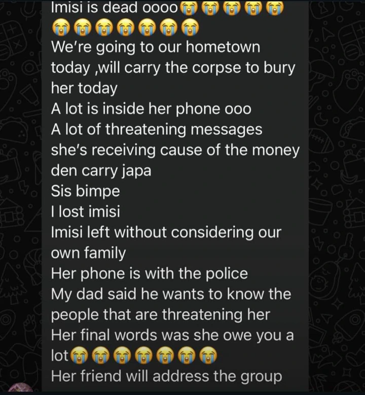 Meanwhile, her sister posted a message in the group claiming they had lost her to debt because she had been threatened.