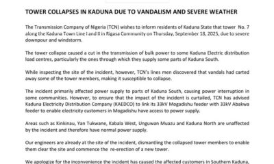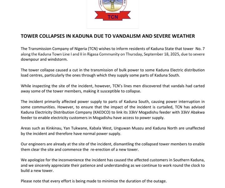 A transmission tower belonging to the Transmission Company of Nigeria (TCN) collapsed in the Rigasa Community of Kaduna State on Thursday, September 18, 2025, following a...