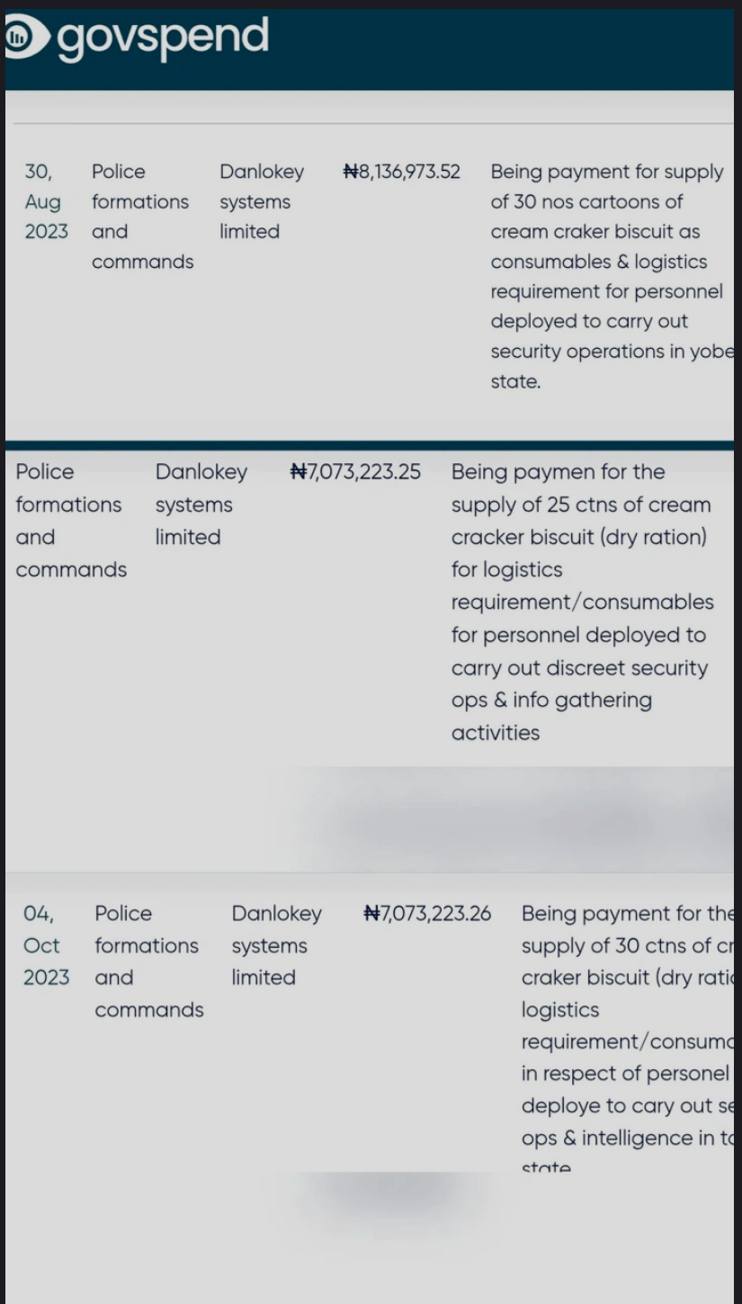 The description read: “Being payment for the supply of 30 cartons of Cream crackers biscuits (Dry ration) for logistics requirements/consumables for personnel deployed to carry out discreet security operations in Yobe State.”