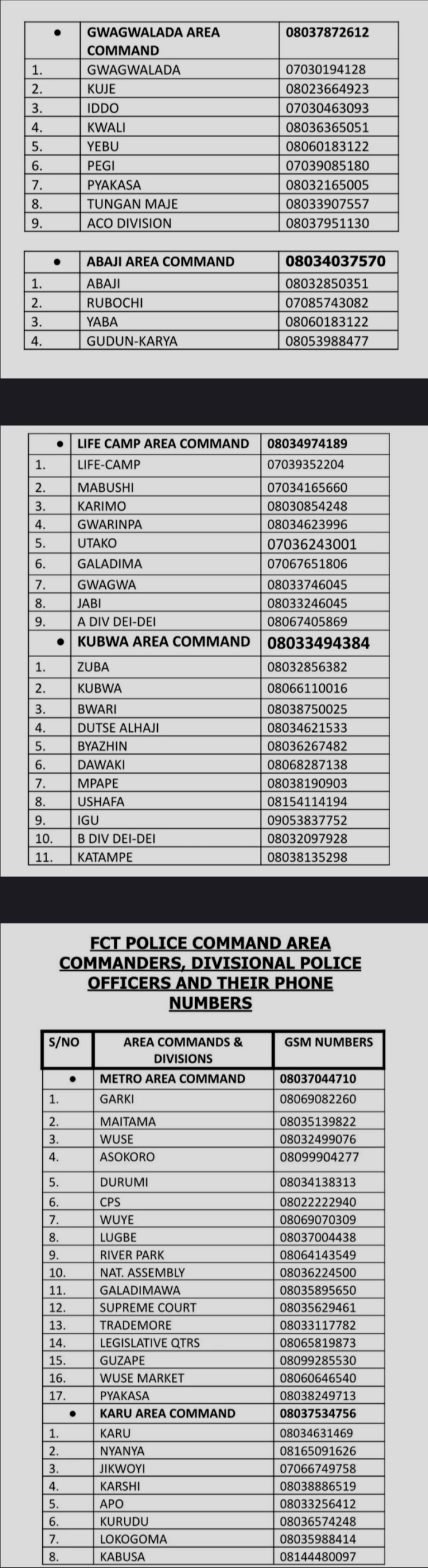 The Federal Capital Territory (FCT) Police Command has released the official telephone numbers of all Area Commanders and Divisional Police Officers (DPOs) across the Territory, in a move aimed at strengthening community policing and improving direct engagement with residents.....TAP TO CONTINUE READING