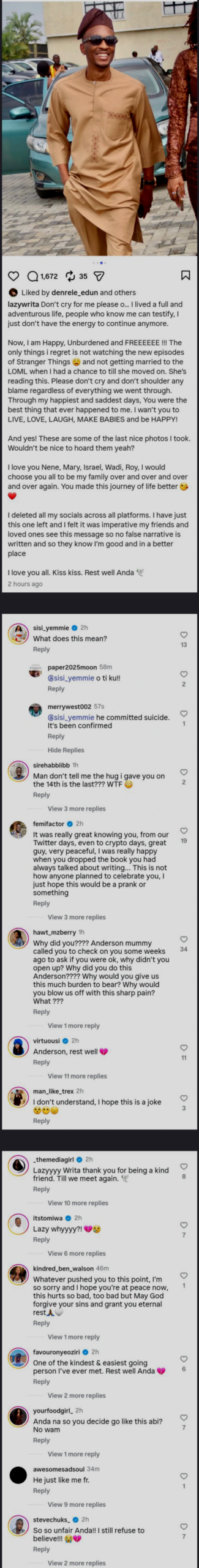 Anderson’s last post reads: “Don’t cry for me please o… I lived a full and adventurous life, people who know me can testify, I just don’t have the energy to continue anymore.