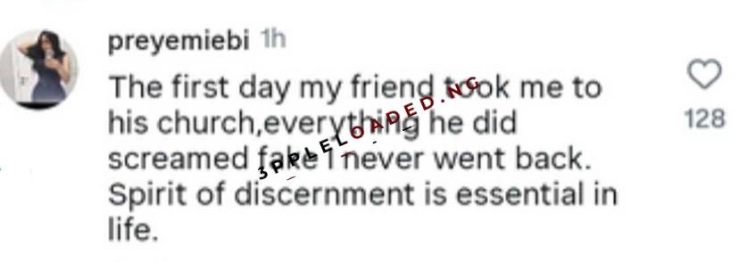 In her words: “The first day my friend took me to his church, everything he did screamed fake. I never went back. Spirit of discernment is essential in life.”