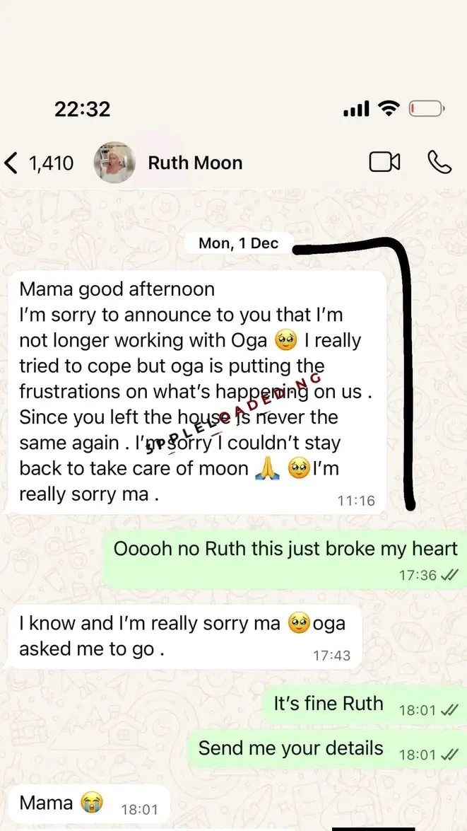The chat reads, “I’m sorry to announce to you that I’m no longer working with oga. I really tried to cope but oga is putting the frustrations on what’s happening on us. Since you left the house, it’s never thesame again. I’m sorry I couldn’t stay back to take care of moon. I’m really sorry ma”.
