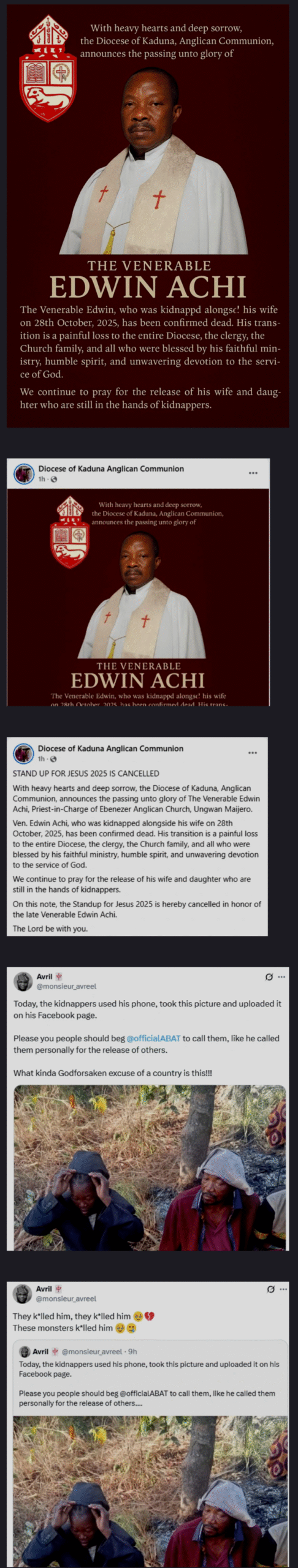 “Ven. Edwin Achi, who was kidnapped alongside his wife on 28th October, 2025, has been confirmed dead. His transition is a painful loss to the entire Diocese, the clergy, the Church family, and all who were blessed by his faithful ministry, humble spirit, and unwavering devotion to the service of God.