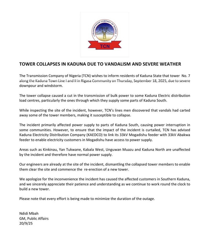 According to a statement released by TCN, Tower No. 7 along the Kaduna Town Line I and II came down during a heavy downpour accompanied by strong winds.