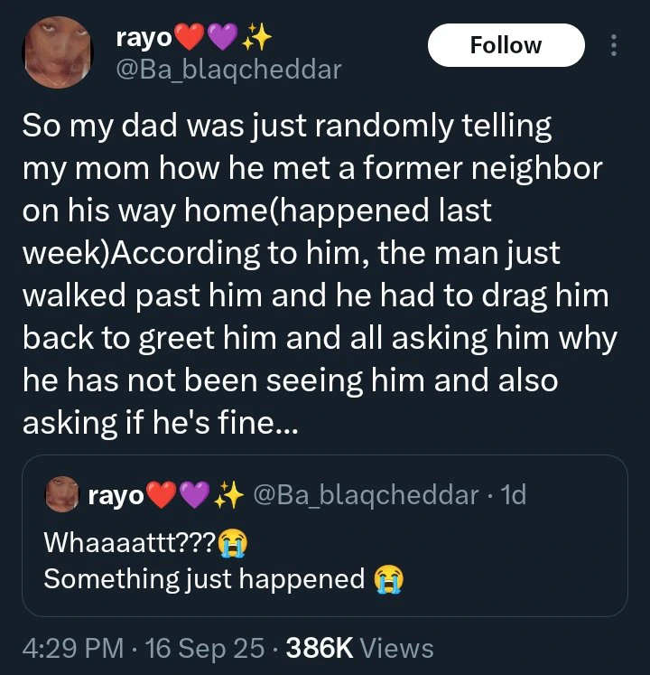 In a post on X (formerly Twitter), the lady, identified as Rayo, said her father came home one day and told them he saw an old neighbour.