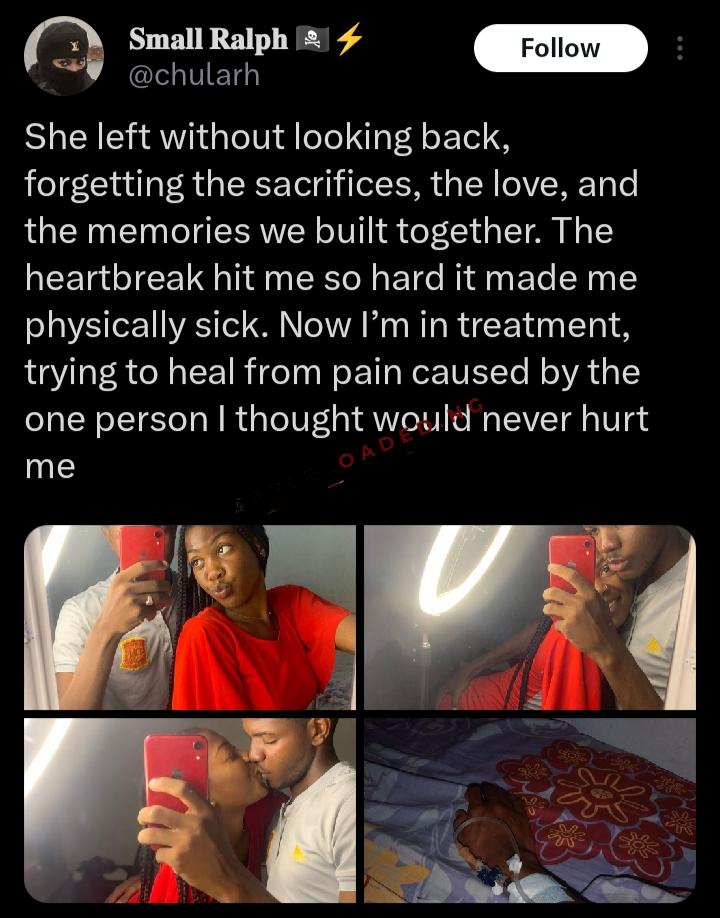 The man, identified as @Chularh on X, posted the image showing him on a drip, explaining that the end of his relationship took a serious toll on his health.