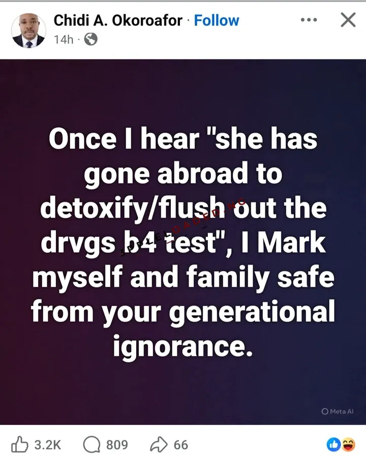 Chidi A. Okoroafor took to Facebook to address reactions to Regina Daniels sharing the result of her drug test.