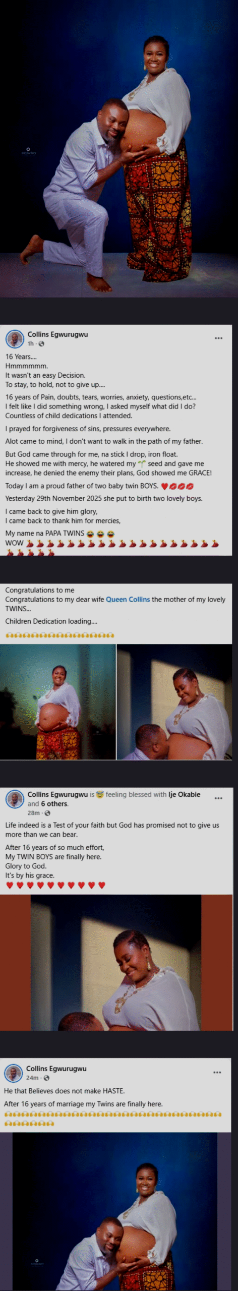 Nigerian man celebrates as his wife gives birth to twins after 16 years of waitingA Nigerian man, Collins Egwurugwu, has celebrated becoming a father after 16 years of marriage.....TAP TO CONTINUE READING