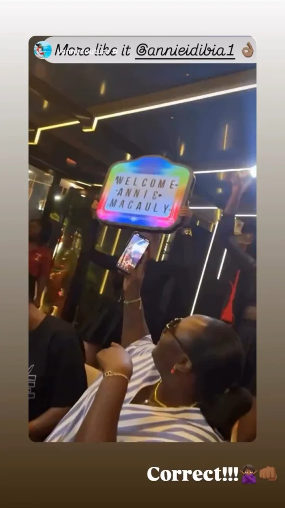 The actress, who is now estranged from husband, singer Innocent “Tuface” Idibia, took to her Instagram Stories to share a video showing the LED welcome banner with “Welcome Annie Idibia” written on it.