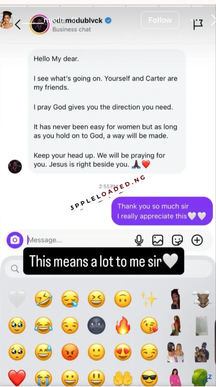 “Hello My dear. I see what’s going on. Yourself and Carter are my friends. I pray God gives you the direction you need. It has never been easy for women but as long as you hold on to God, a way will be made. Keep your head up. We will be praying for you. Jesus is right beside you.”