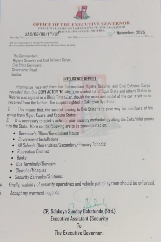 According to an internal memo dated November 23, 2025, and signed by CP Odukoya Sunday Babatunde (Rtd.), Executive Assistant on Security to the Oyo State Governor, Seyi Makinde, the warning was triggered by information received from the Nigeria Security and Civil Defence Corps (NSCDC), Oyo Command.