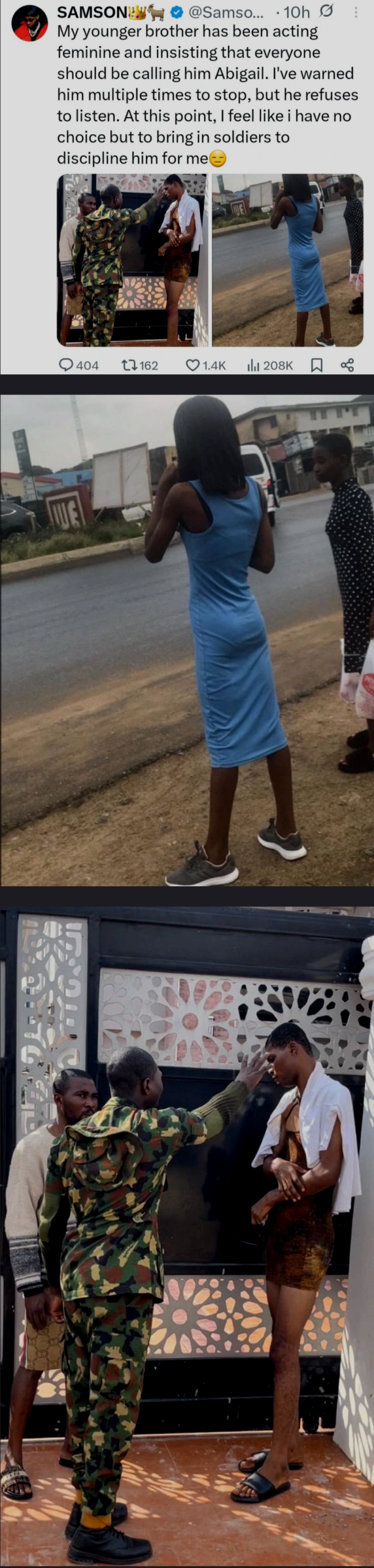 He shared a photo of a uniformed man confronting his cross-dressing brother and wrote: “My younger brother has been acting feminine and insisting that everyone should be calling him Abigail. I’ve warned him multiple times to stop, but he refuses to listen. At this point, I feel like i have no choice but to bring in soldiers to discipline him for me”