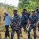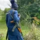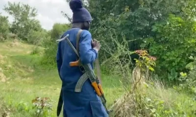 BBC A bandit in Zamfara state dressed in dark blue and holding a gun over his shoulder walks away from the camera in a forested area....