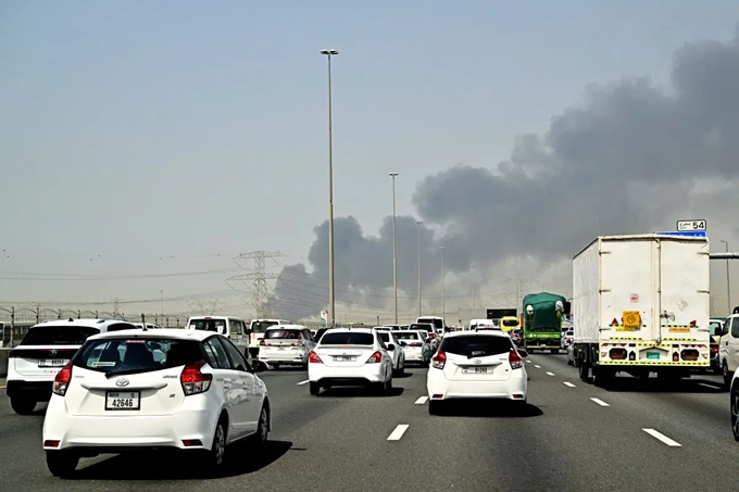 Smoke billows from an ongoing fire near Dubai International Airport as vehicles drive on a highway in Dubai on March 16, 2026. Flights were gradually resuming at Dubai airport on March 16, previously the world’s busiest for international flights, the airport operator said, after a “drone-related incident” sparked a fuel tank fire nearby, as Iran kept up its Gulf attacks. (Photo by AFP) /....TAP TO CONTINUE READING