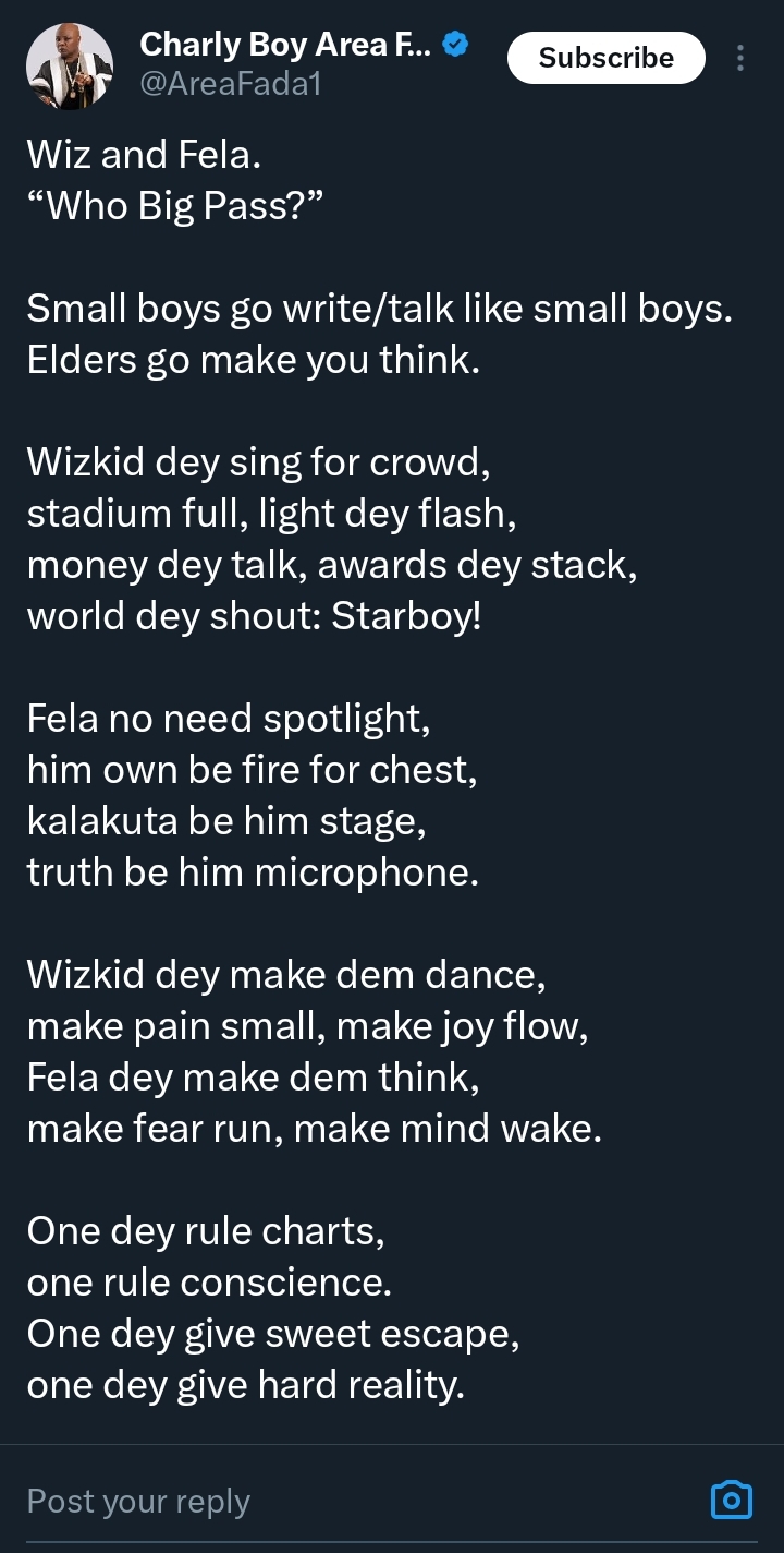 “One dey rule charts, one rule conscience,” he said, adding that Wizkid represents fame and enjoyment, while Fela symbolises resistance and freedom.