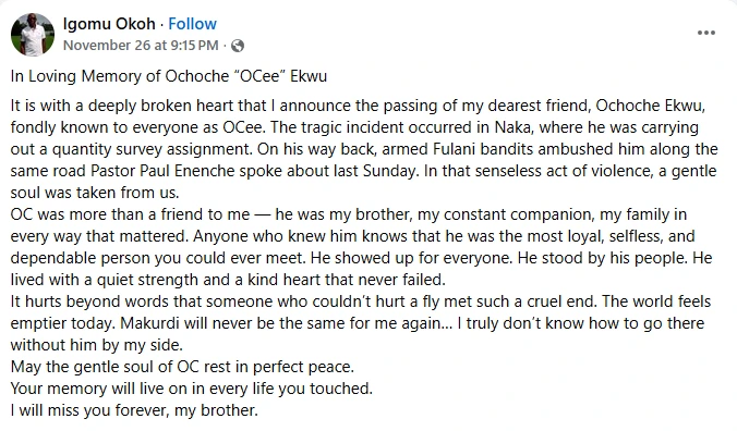 During the exchange of fire, Ekwu, the driver of the engineers’ vehicle, was hit by a stray bullet and d!ed on the spot.
