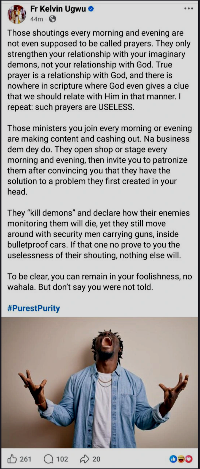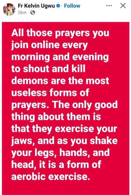 He wrote: “All those prayers you join online every morning and evening to shout and kill demons are the most useless forms of prayers.