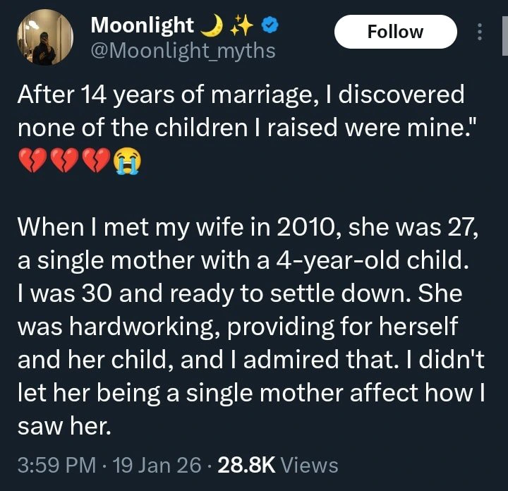 A man has shared a heartbreaking account of betrayal after discovering that none of the three children he raised during his 14-year marriage were biologically his.....TAP TO CONTINUE READING