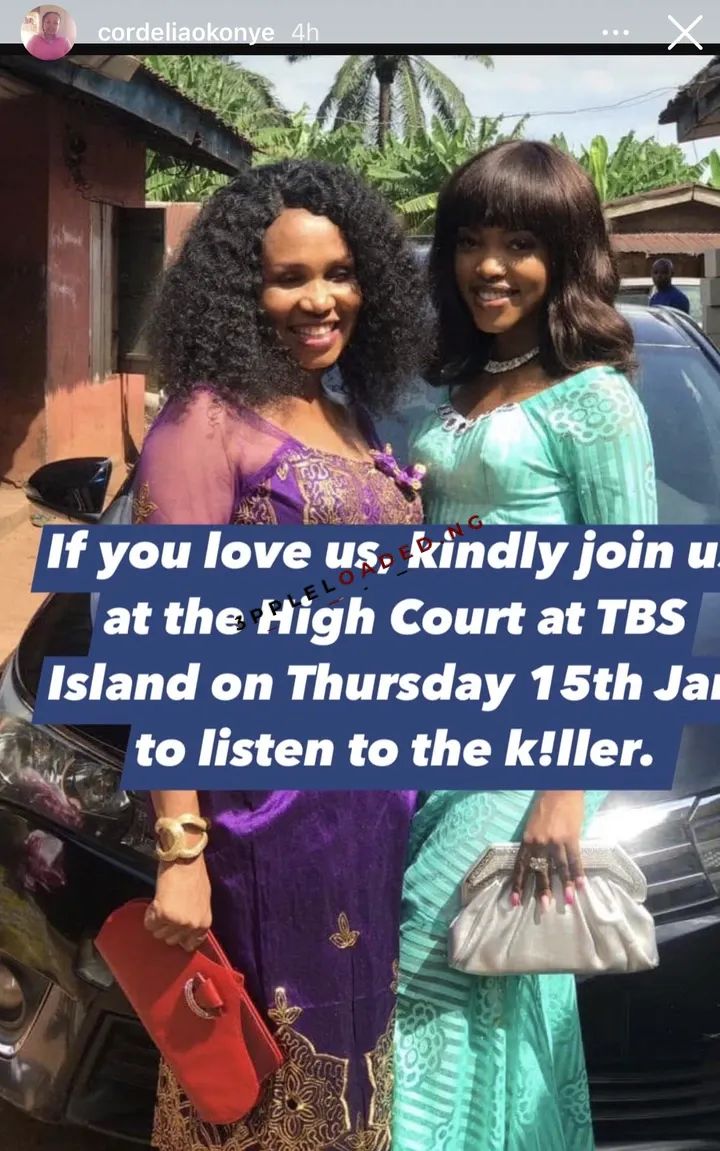 Cordelia Okonye, the mother of Augusta Onuwabhagbe who was k!lled in 2023, gave the update on her Instastories. She said the trial will be heard at the High Court , Tafawa Balewa Square and enjoined everyone to come listen to K!llaboi confess.