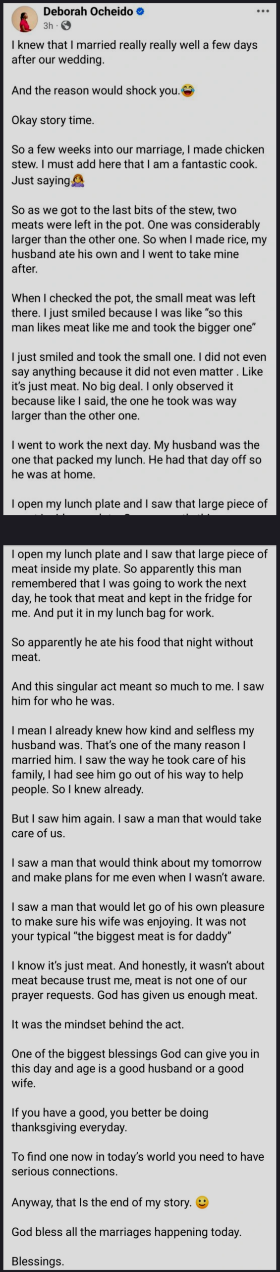 Deborah Ocheido took to Facebook to share how her husband put his need above hers. She said that singular incident reassured her that she chose well.