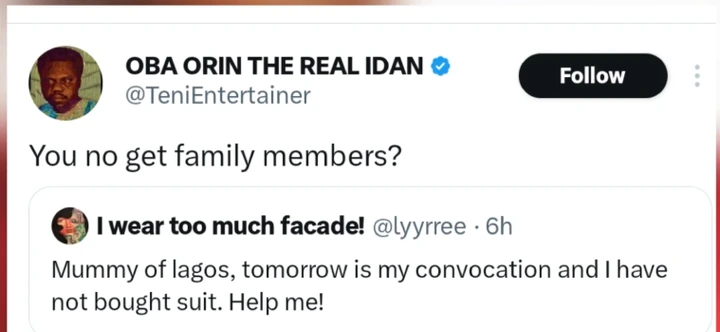 A fan had reached out to her on X, pleading for help to buy a suit for his convocation tomorrow.